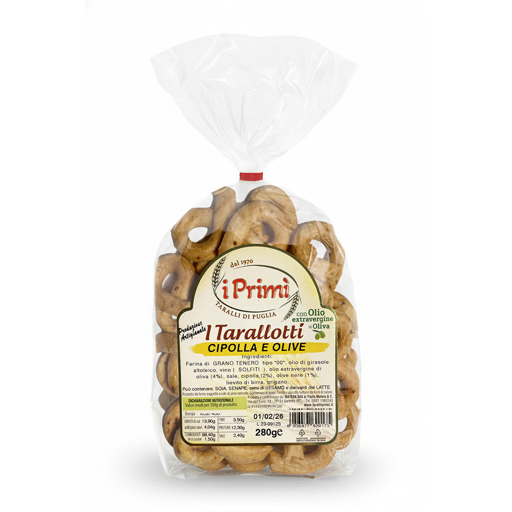 Farina di GRANO TENERO tipo "00", olio di girasole altoleico, vino (SOLFITI), olio extravergine di oliva (4%), sale, cipolla (2%), olive nere (1%), lievito di birra, origano.