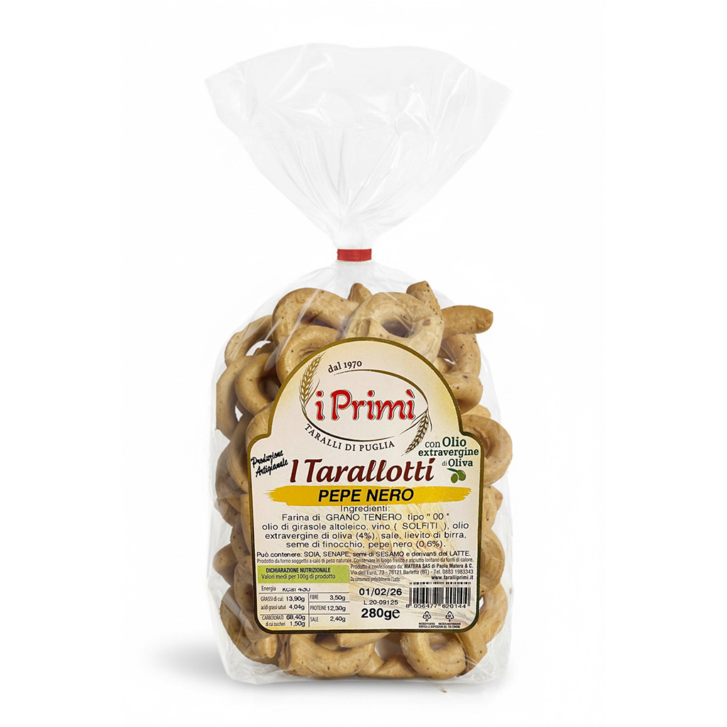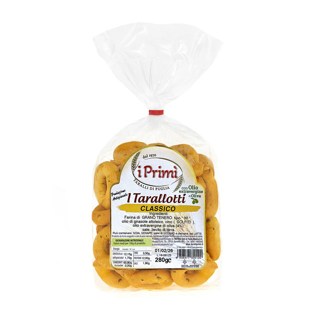 Farina di GRANO TENERO tipo "00", olio di girasole altoleico, vino (SOLFITI), olio extravergine di oliva (4%), sale, lievito di birra, seme di finocchio, pepe nero (0,6%).