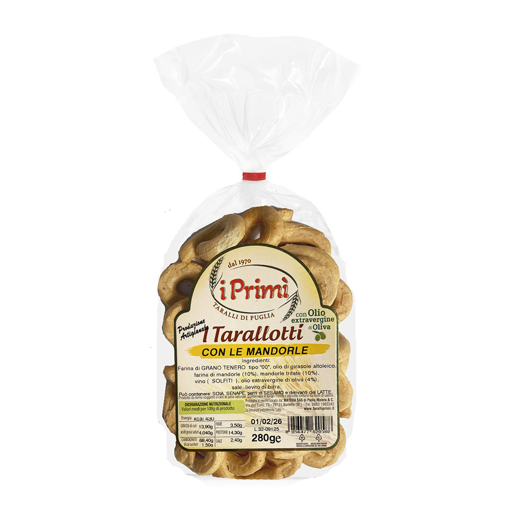 Farina di GRANO TENERO tipo "00", olio di girasole altoleico, farina di mandorle (10%), mandorle tritate (10%), vino (SOLFITI), olio extravergine di oliva (4%), sale, lievito di birra.