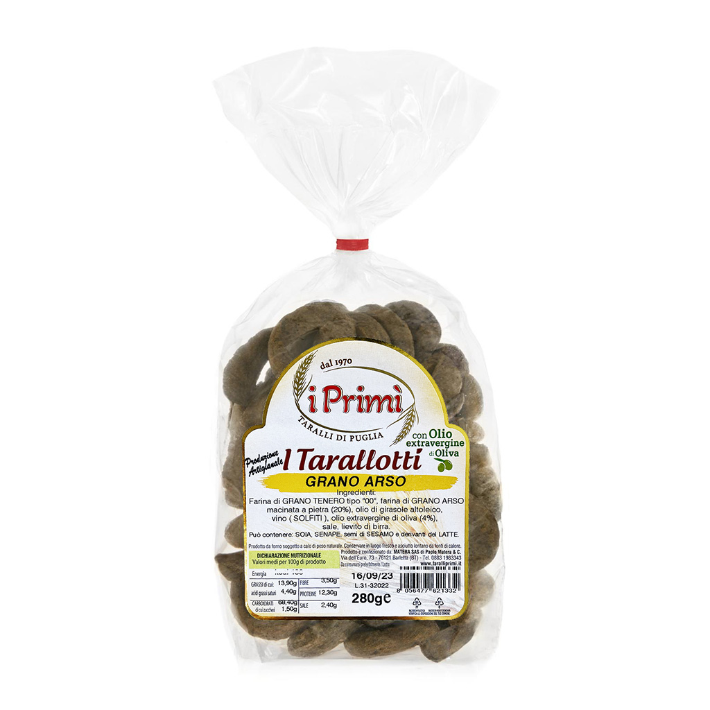 Farina di GRANO TENERO tipo "00", farina di GRANO ARSO macinata a pietra (20%), olio di girasole altoleico, vino (SOLFITI), olio extravergine di oliva (4%), sale, lievito di birra