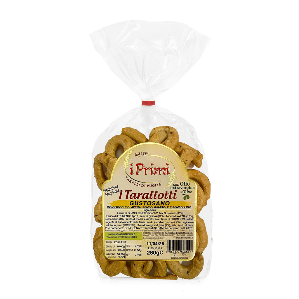 Farina di GRANO TENERO tipo "00", Mix Gustosano (30%), Farina di FRUMENTO tipo 1, semi di girasole(12%), fiocchi di AVENA (12%), semi di lino (6%), lievito di madre essicato, sale, farina di FRUMENTO maltato agente di trattamento della farina: acido ascorbico, enzimi). Olio di girasole altolecio, vino (SOLFITI), olio extravergine di oliva (4%), sale, lievito di birra.