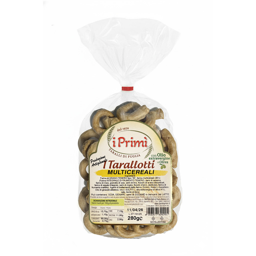Farina di GRANO TENERO tipo "00", farina multicereali (30%) Farina INTEGRALE DI FRUMENTO TENERO, semi di sesamo, farina di mais, granella di soia, semi di lino, fiocchi di avena decorticati, farina di segale integrale, semi di miglio, fiocchi d'orzo, destrosio, farina di frumento maltato). Agenti di trattamento della farina: Enzimi, Acido L-Ascorbico. Olio di girasole altoleico, vino (SOLFITI), olio extravergine di oliva (4%), sale, lievito di birra.