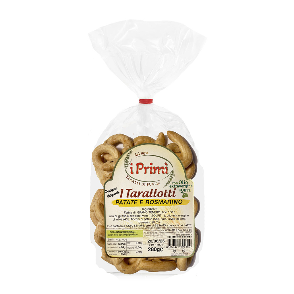 Farina di GRANO TENERO tipo "00", olio di girasole altoleico, vino (SOLFITI), olio extravergine di oliva (4%), fiocchi di patate (5%), sale, lievito di birra, rosmarino (0,5%).