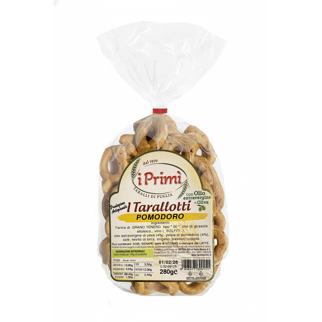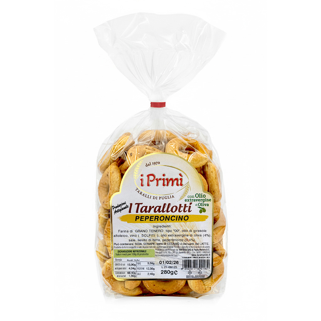 Farina di GRANO TENERO tipo "00", olio di girasole altoleico, vino (SOLFITI), olio extravergine di oliva (4%), sale, lievito di birra, peperoncino (0,4%).