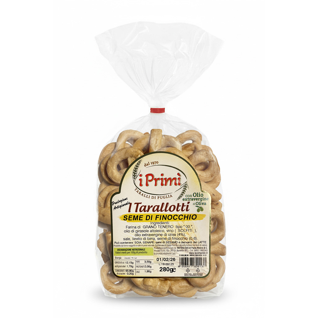 Farina di GRANO TENERO tipo " 00", olio di girasole altoleico, vino (SOLFITI), olio extravergine di oliva (4%), sale, lievito di birra, seme di finocchio (0,6).