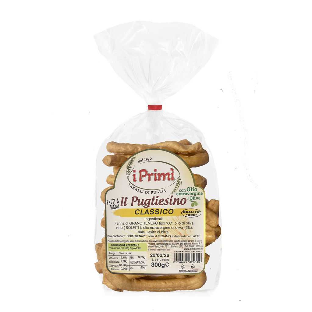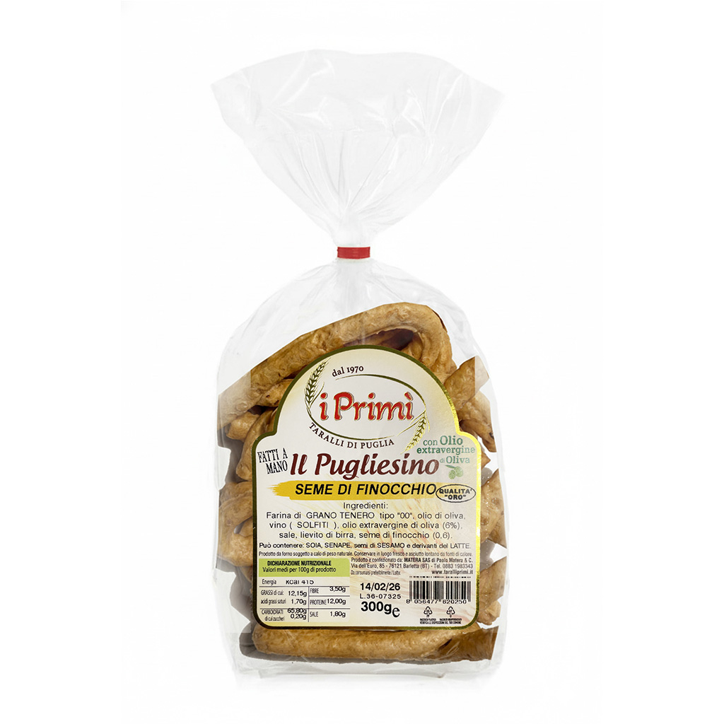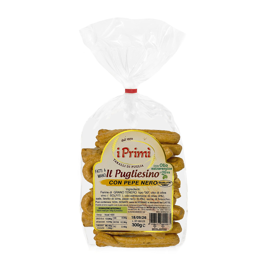 Farina di GRANO TENERO tipo "00", olio di oliva vino ( SOLFITI ), olio extravergine di oliva (4%), sale, lievito di birra, pepe nero (0,6%), seme di finocchio.