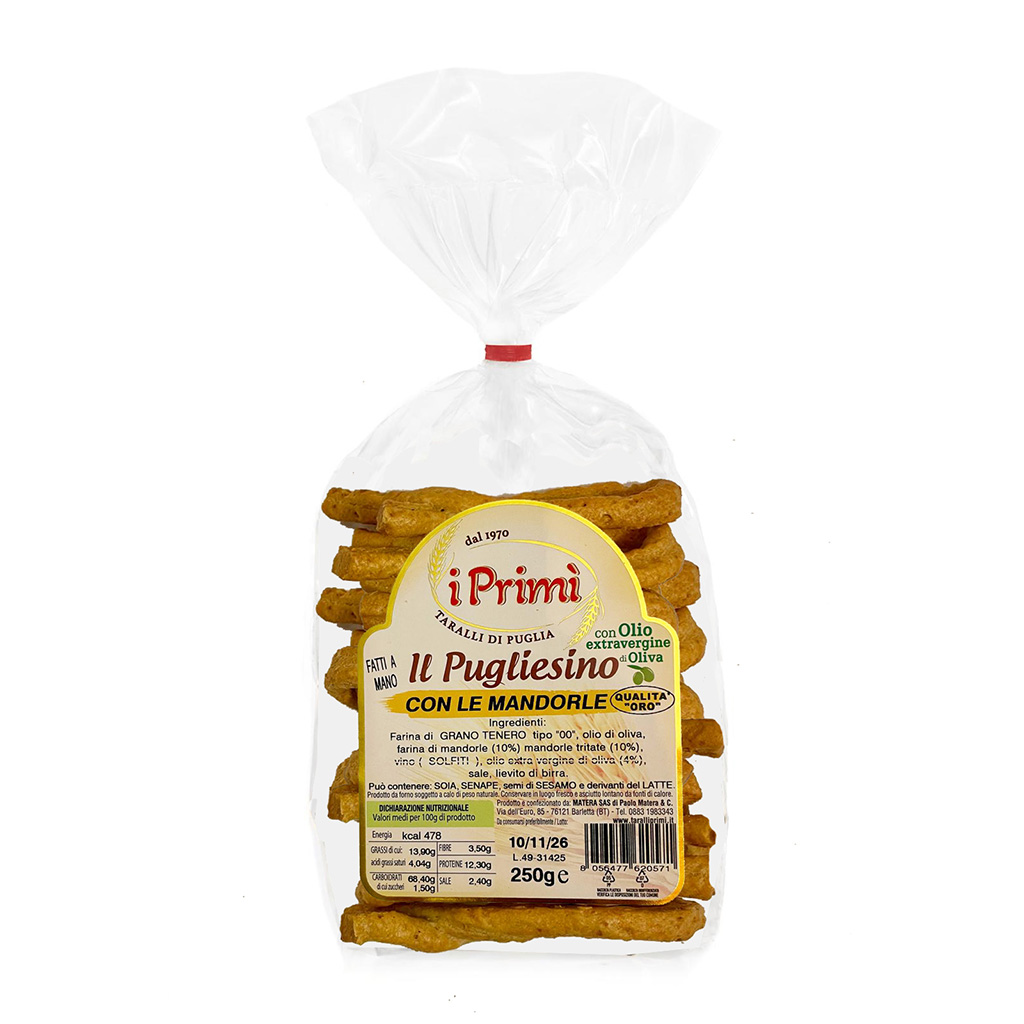 Farina di GRANO TENERO tipo "00", olio di oliva, farina di mandorle (10%) mandorle tritate (10%), vino ( SOLFIT! ), olio extra vergine di oliva (4%), sale, lievito di birra.