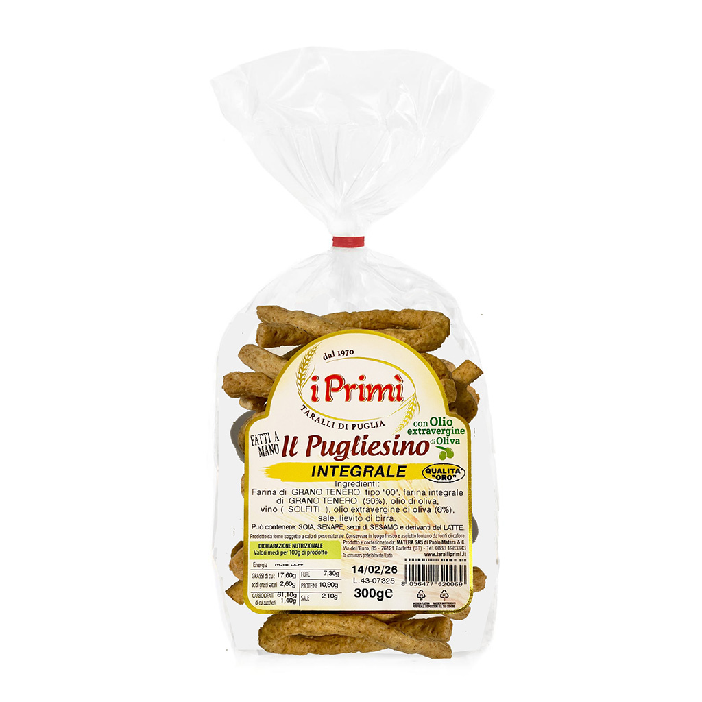 Farina di GRANO TENERO tipo "00", farina integrale di GRANO TENERO (50%), olio di oliva, vino (SOLFITI), olio extravergine di oliva (6%), sale, lievito di birra.