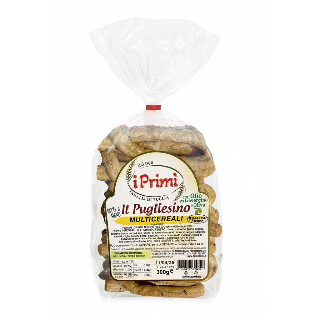Farina di GRANO TENERO tipo "00", farina multicereali (30%), Farina INTEGRALE DI FRUMENTO TENERO, semi di sesamo, fanna di mais, granella di soia, semi di lino, fiocchi di avena decorticati, tarina di segale integrale, semi di miglio, fiocchi d'orzo, destrosio, farina di frumento maltato) Agenti di trattamento della farina: Enzimi, Acido L-Ascorbico. Olio di oliva, olio extravergine di oliva (6%), vino (SOLFITI), sale, lievito di birra.