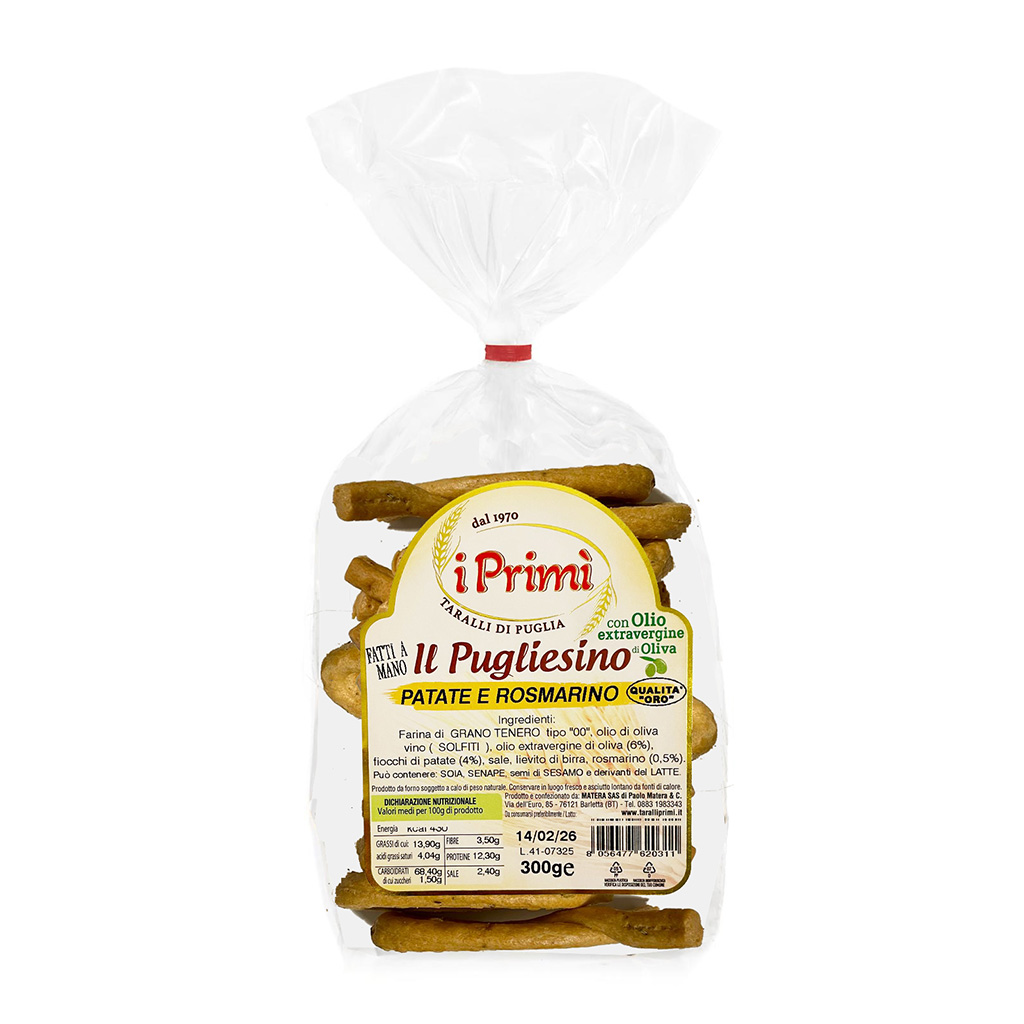 Farina di GRANO TENERO tipo "00", olio di oliva vino (SOLFITI), olio extravergine di oliva (6%), fiocchi di patate (4%), sale, lievito di birra, rosmarino (0,5%).