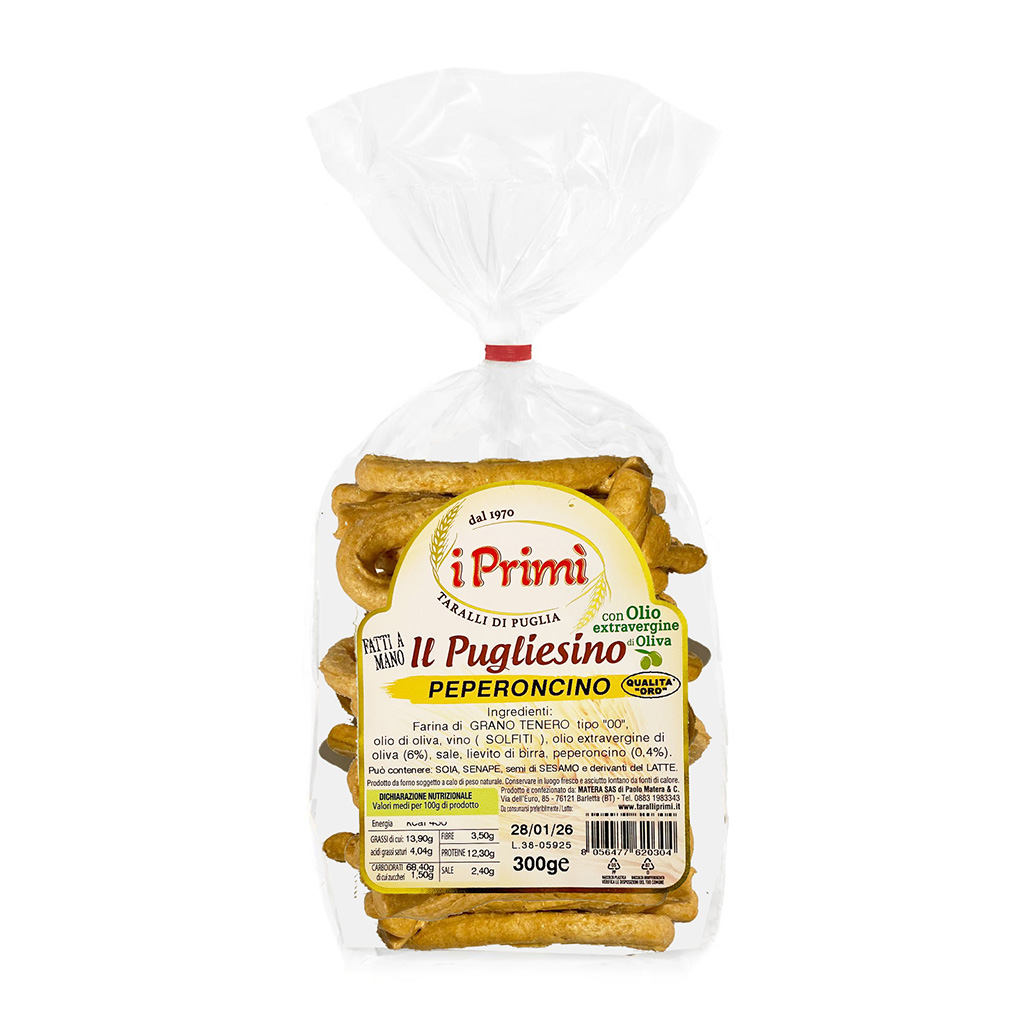 Farina di GRANO TENERO tipo "00", olio di oliva, vino (SOLFITI), olio extravergine di oliva (6%), sale, lievito di birra, peperoncino (0,4%).