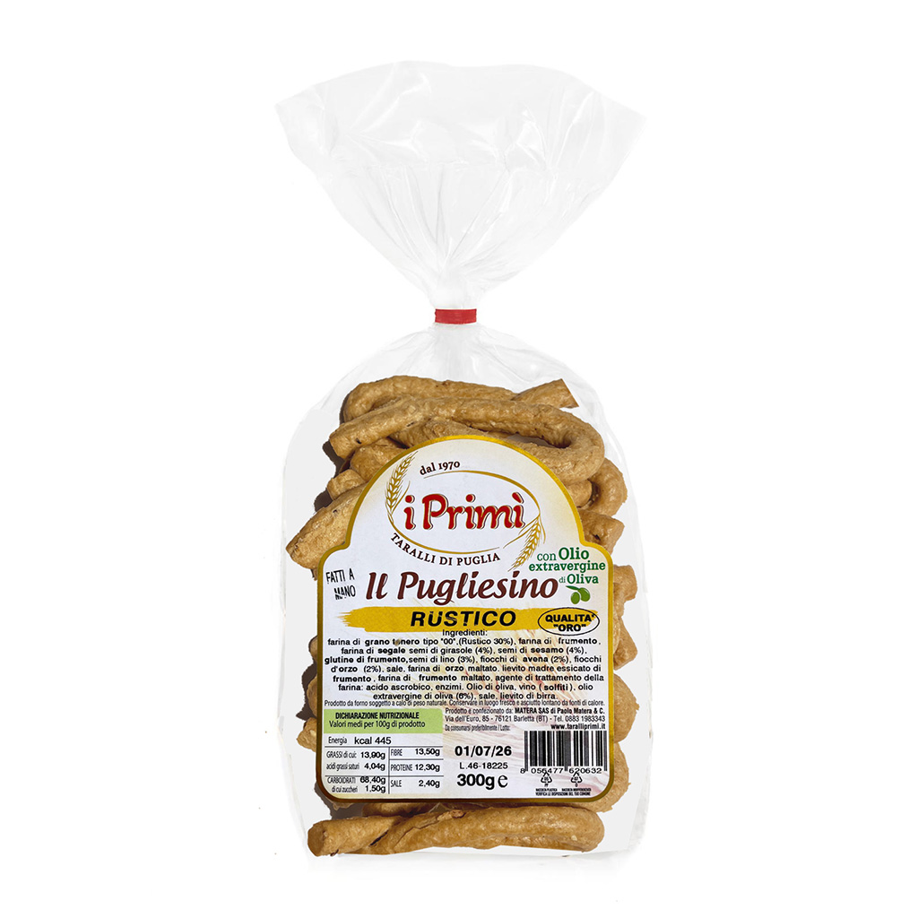 farina di grano tenero tipo "00", (Rustico 30%), farina di frumento, farina di segale semi di girasole (4%), semi di sesamo (4%), glutine di frumento, semi di lino (3%), fiocchi di avena (2%), fiocchi d'orzo (2%). sale. farina di orzo maltato. lievito madre essicato di frumento, farina di frumento maltato, agente di trattamento della farina: acido ascrobico, enzimi. Olio di oliva, vino (solfiti), olio extravergine di oliva (6%), sale, lievito di birra.